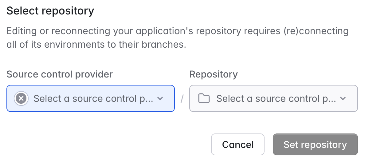 - Click the “Source control provider” dropdown to select an existing source control provider or connect a new one by clicking “Add account”.