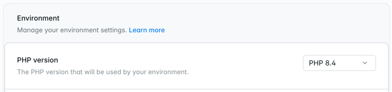 Currently, Laravel Cloud supports PHP 8.2, 8.3, and 8.4. You may select the PHP version that should be used by an environment on the environment’s General Settings page. After changing the PHP version, a re-deployment is required in order for the changes to take effect.