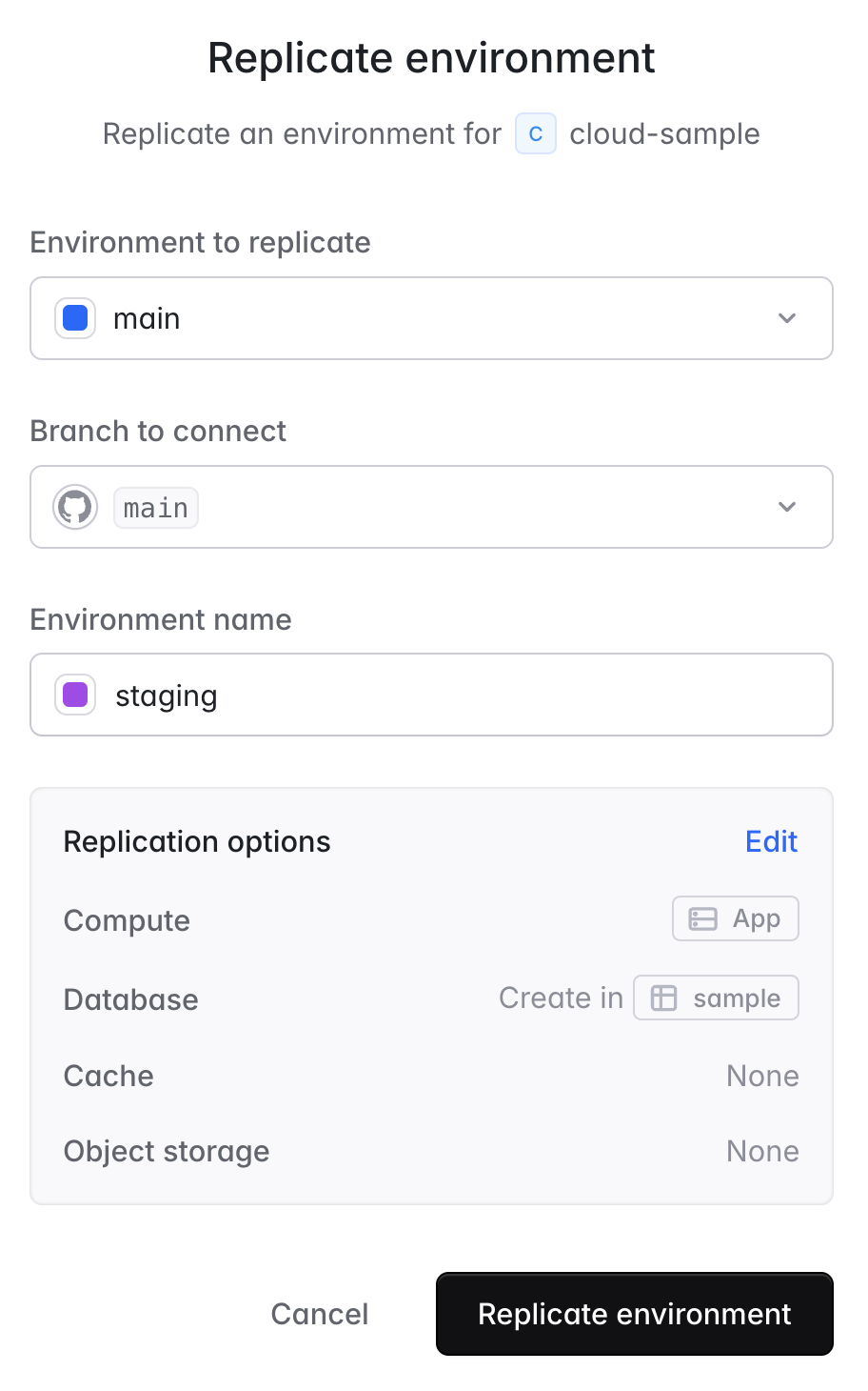 It is common for environments in the same application to have similar or identical resource and settings configurations. Therefore, when creating new environments, it is often more convenient to clone an existing environment and make changes rather than creating a new environment from scratch. To replicate an environment, click the ”…” button next to the environment’s “Deploy” button. Then, click “Replicate”. Confirm you are replicating the correct environment and git branch, then enter a name for your new environment. By default, all General, Environment, and Deployment settings will be duplicated. You can optionally edit the default replication settings for compute and resources. The default replication behavior is:- Compute: duplicate all clusters (including size, autoscaling, hibernation, scheduler, Octane, Inertia, and background process settings)