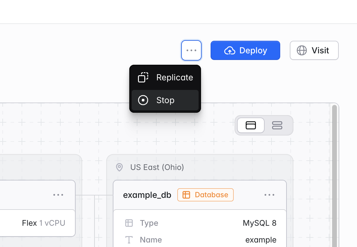 To stop an environment, click the ”…” button next to the environment’s “Deploy” button. Then, click “Stop”. When you stop an environment, all App and Worker clusters within the environment will be shutdown. This means all web traffic, background processes, and scheduled tasks will stop processing. You will not be charged for the environment’s compute, but you will still be charged for any attached resources. You can restart the environment using the same dropdown menu. A full deployment is required to restart an environment.