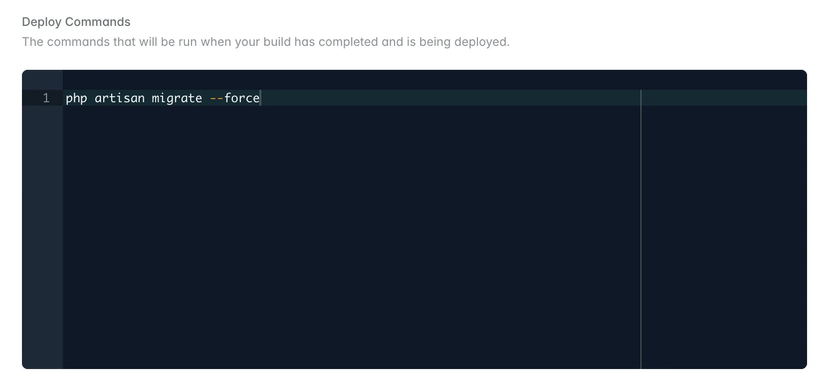Your environment’s “Deploy Commands” are run on your Laravel Cloud infrastructure just before a new deployment goes “live”. Typically, these commands will be used to migrate your environment’s database. Unlike build commands, changes made to the filesystem by deploy commands will not be persisted to your application.