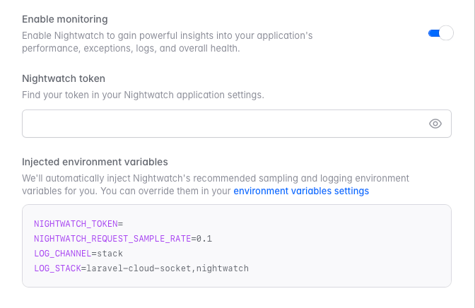 Laravel Cloud environments have built-in support for Laravel Nightwatch monitoring. Nightwatch provides deep insights into your application environment’s performance, exceptions, logs, and overall health.
