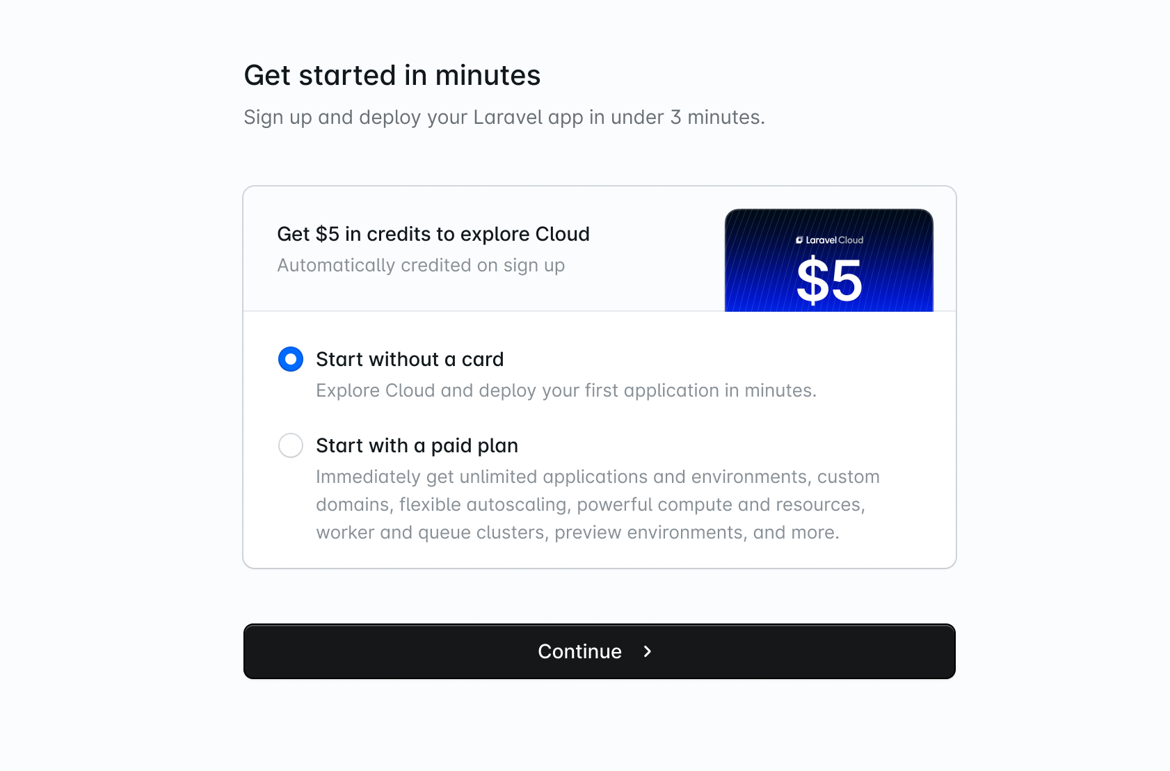 Laravel Cloud offers a free trial with no credit card required. When you sign up, you receive $5 in one-time credits to spend on real infrastructure. Deploy an application, spin up a database, add a cache, and see how Laravel Cloud works before committing to a paid plan.Getting started