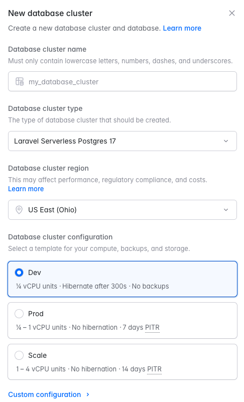 - To create a new cluster: Select “Laravel Serverless Postgres” as your database cluster type and configure: